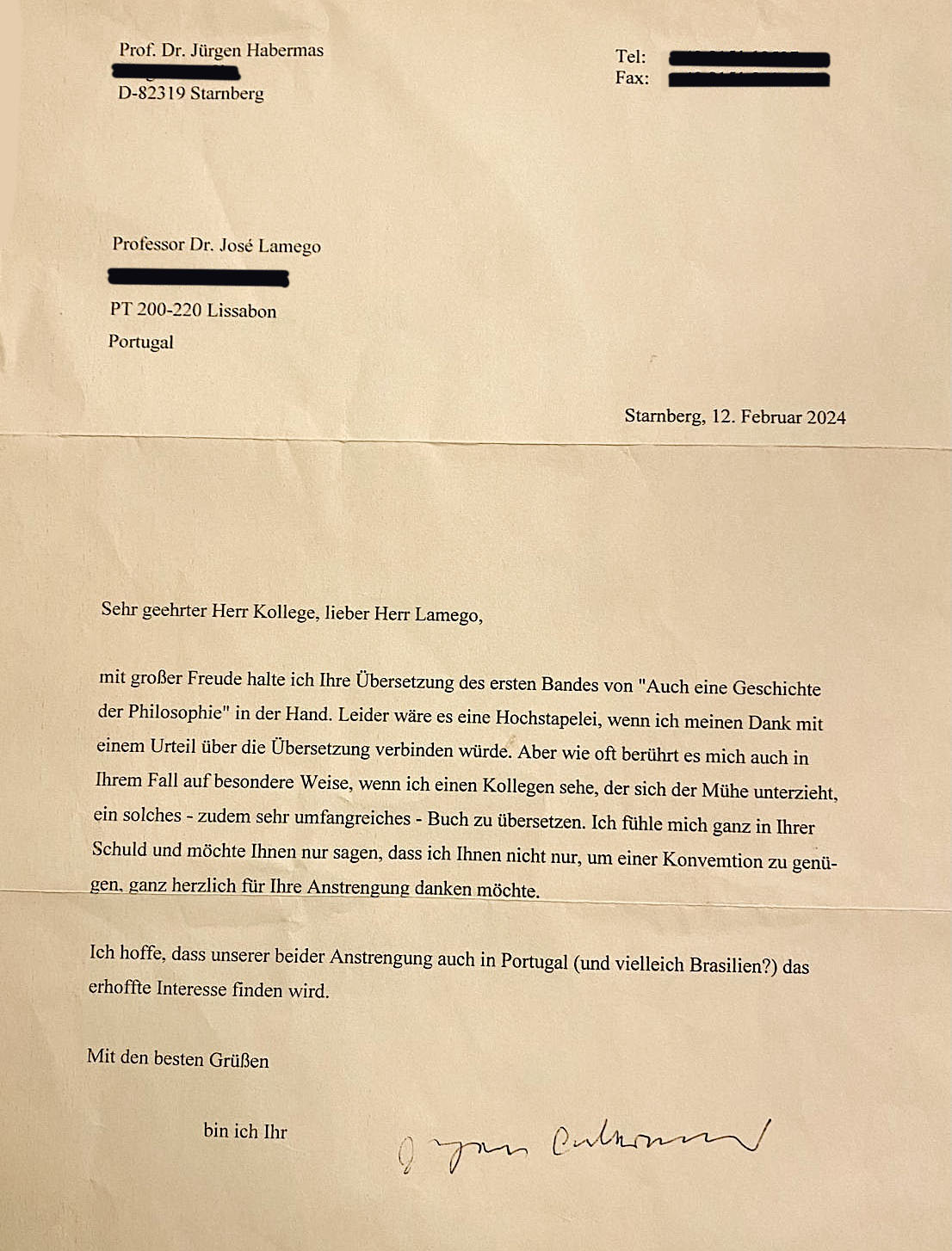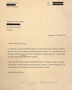 Para concluir esta singela homenagem proporcionada pelo João Almeida Santos, junto, como mera curiosidade, cópia de duas cartas de Habermas em que este agradece o empenho posto na tradução dos dois volumes de Uma Outra História da Filosofia (JL).